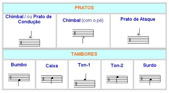 Abaixo, vamos conhecer as FIGURAS que REPRESENTAM as PEÇAS DA BATERIA no pentagrama (as principais). O que determina isso, é o “ESPAÇO” ou a “LINHA” do pentagrama onde a figura esta escrita. Vejamos: