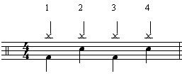 Abaixo temos uma batida de bateria em um compasso 4/4. Como todas as notas abaixo são “semínimas”, segundo a fórmula de compasso, teremos uma “semínima” por tempo (dúvida sobre isso consulte a aula anterior). Porém, em cada tempo, temos duas notas que estão sendo executadas simultaneamente.