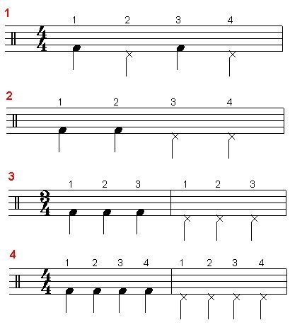 No PRIMEIRO tempo temos: chimbal e bumbo; no SEGUNDO: chimbal e caixa; no TERCEIRO: chimbal e bumbo; e no QUARTO: chimbal e caixa. Veja: