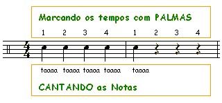 1º ESTUDO: Primeiramente, vamos praticar CANTANDO as notas em voz alta (taaaa) e marcando os tempos do compasso (1, 2, 3, 4) com PALMAS. Esse estudo é chamado de “solfejo rítmico”. Veja a representação abaixo: